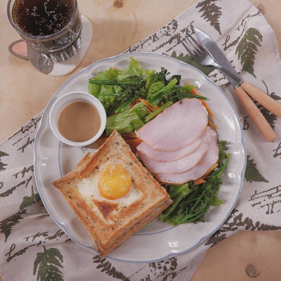 – A: Lấy 2 lát bánh mì, dùng mũi dao sắc cắt lấy một hình vuông ở chính giữa bánh, bạn có thể lấy một chiếc bát nằm gọn giữa lát bánh, dùng miệng bát ấn mạnh để cắt. Lưu ý hãy chừa một phần rìa khoảng 1 cm để trứng không bị tràn ra ngoài.