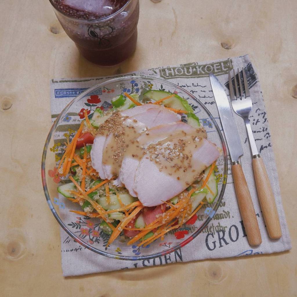 – Bày diêm mạch lên đĩa, xếp ức gà đã thái miếng lên, dọn các loại rau ăn kèm bên cạnh, rưới sốt lên và thưởng thức.