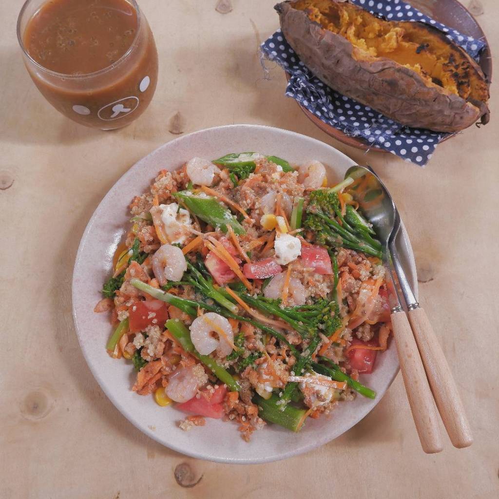 Cơm diêm mạch với gà áp chảo và rau củ.