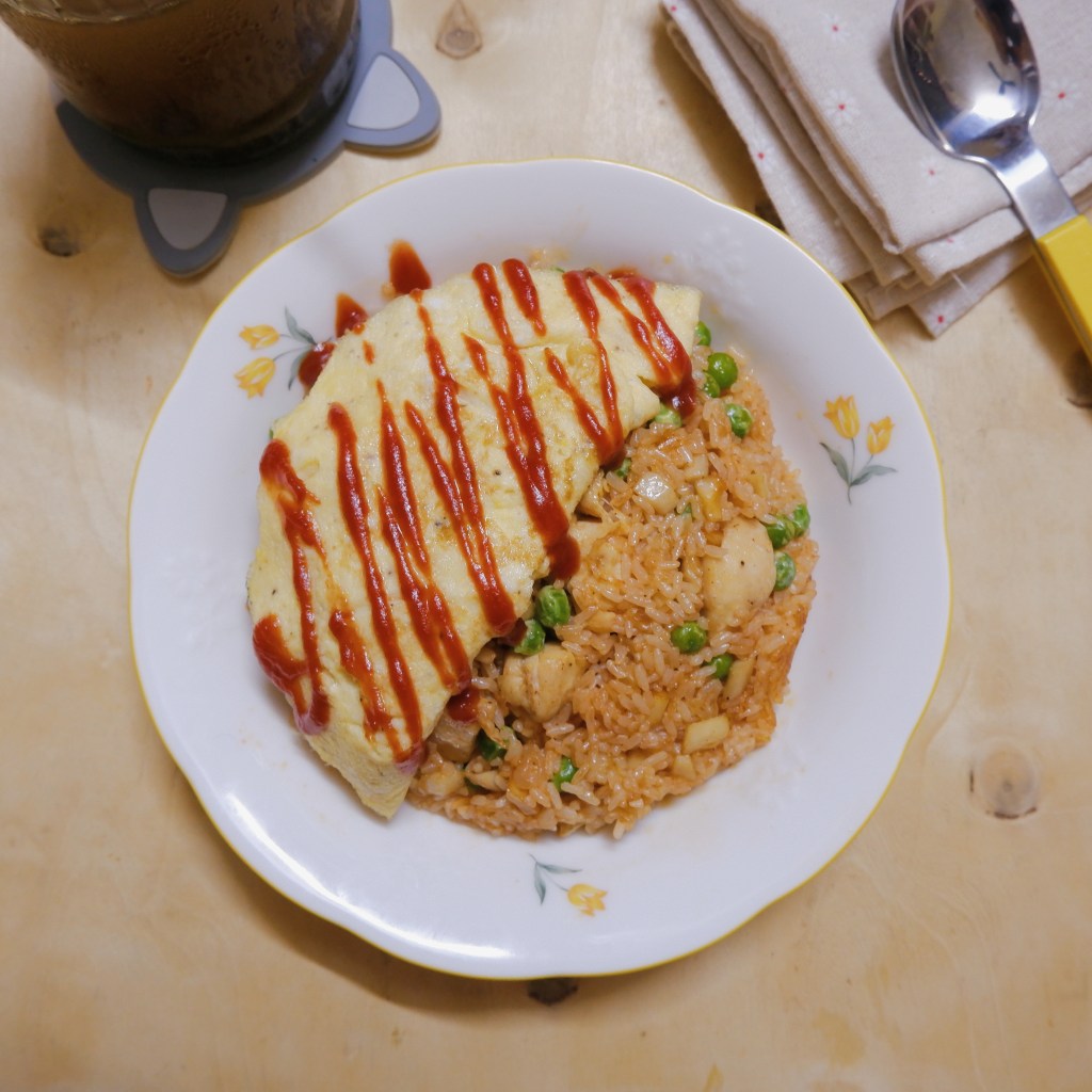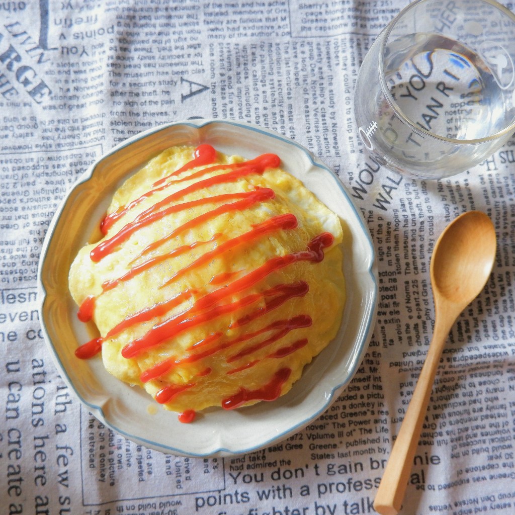 – Phủ trứng lên cơm, rưới Ketchup lên là xong rồi