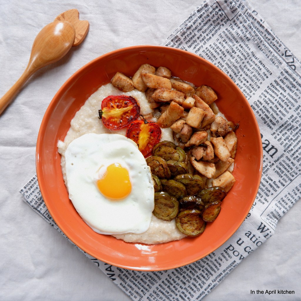 – Láng bơ lên chảo, ốp chín trứng, chia ra các đĩa. Tương tự xào chín cà tím, áp chảo xém cà chua, và xào chín thịt gà rồi chia lên các đĩa. Đun nóng một chút bơ, rưới bơ chảy lên trên cùng, rắc thêm thật nhiều tiêu và thưởng thức.