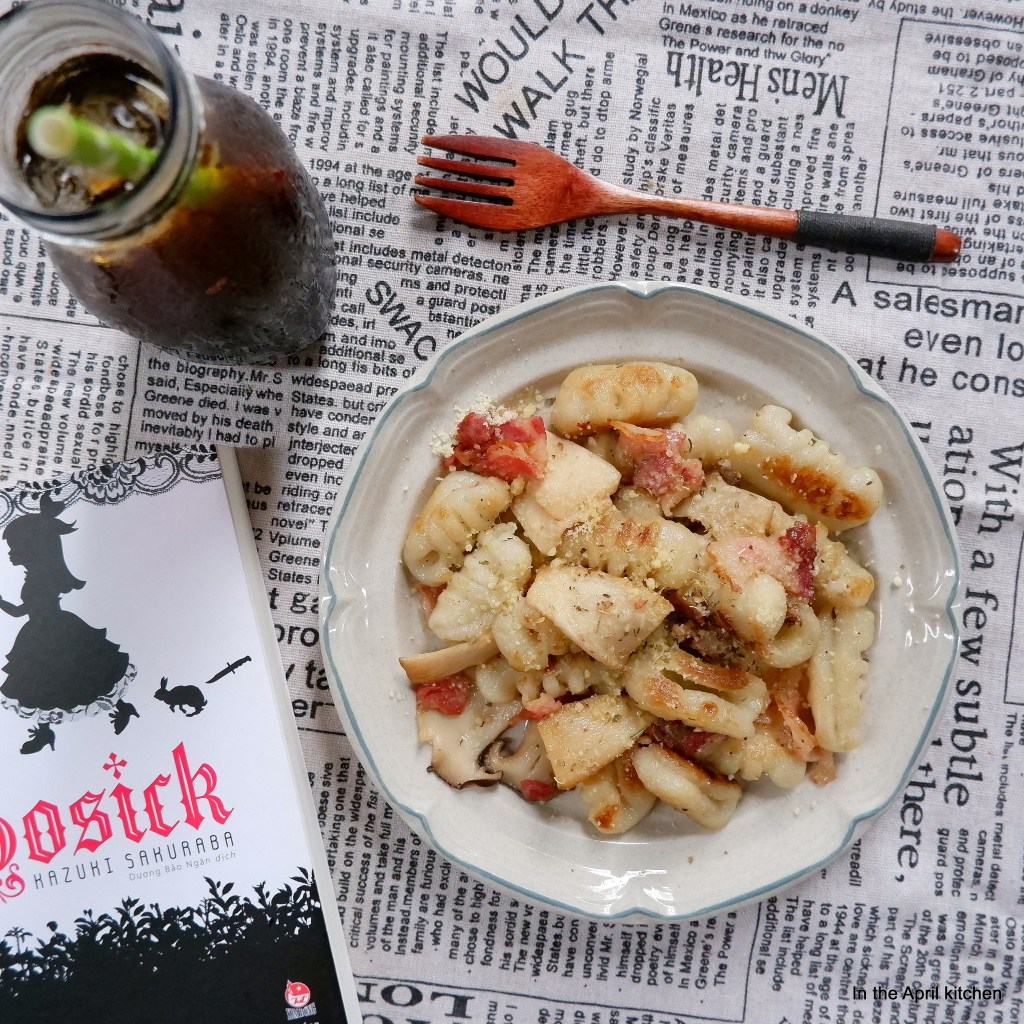 – Láng dầu oliu lên chảo, cho tỏi vào phi thơm, cho thịt xông khói vào đảo tới khi thịt xém thì cho nấm vào xào. Tới khi nấm chín thì cho Gnocchi vào xào cho xém nhẹ. Nêm nếm với muối, tiêu, lá thơm kiểu Ý.