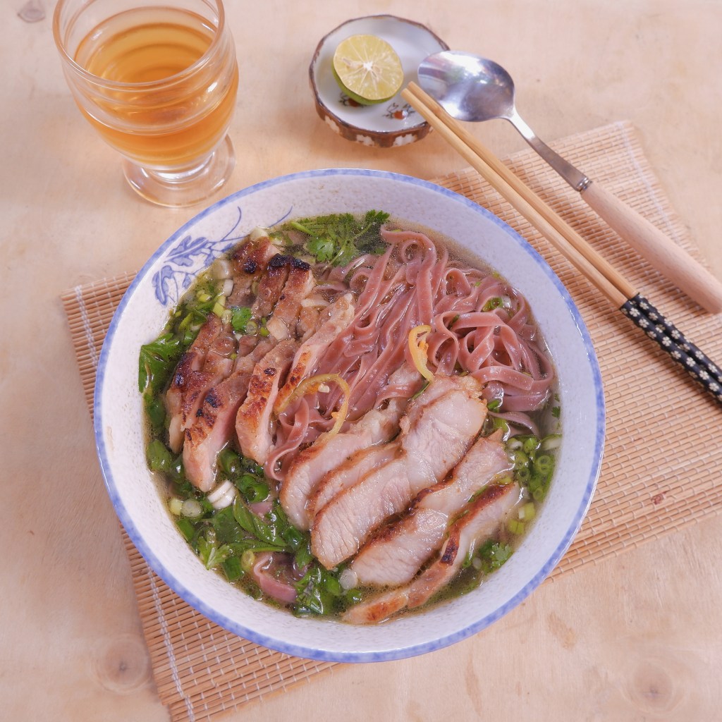 – Luộc phở lứt tới khi phở chín thì vớt ra, chia vào bát. Cho rau hành lên, xếp thịt lên và chan nước dùng lên. Rắc tiêu, vắt chanh và cắt ớt tươi hoặc ớt tương lên.