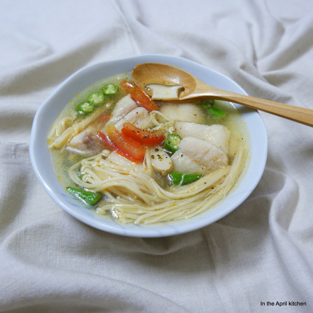 – Láng dầu lên chảo, cho hành khô vào phi thơm, cho cà chua vào xào tới khi cà chua mềm thì cho nấm đùi gà vào đảo đều. Đổ nước dùng vào nồi, đợi nước sôi thì cho cá, đun tới khi cá chín thì cho nấm kim châm và đậu bắp. Tắt bếp, nêm nếm với gia vị và chanh để có độ chua ưng ý.