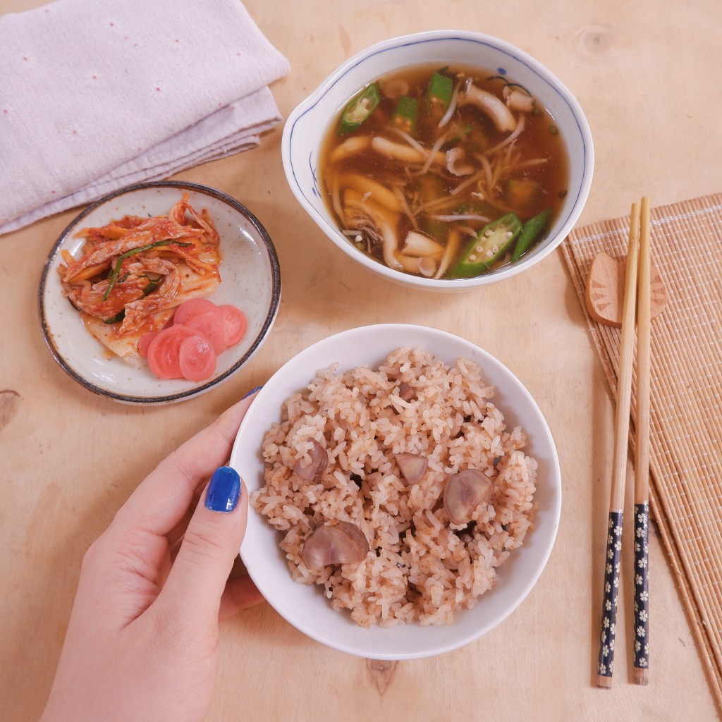 – Cơm chín, nhẹ nhàng xới cho hạt dẻ và cơm trộn đều, có thể ăn cùng rong biển, vừng hoặc thức ăn mặn như bình thường.