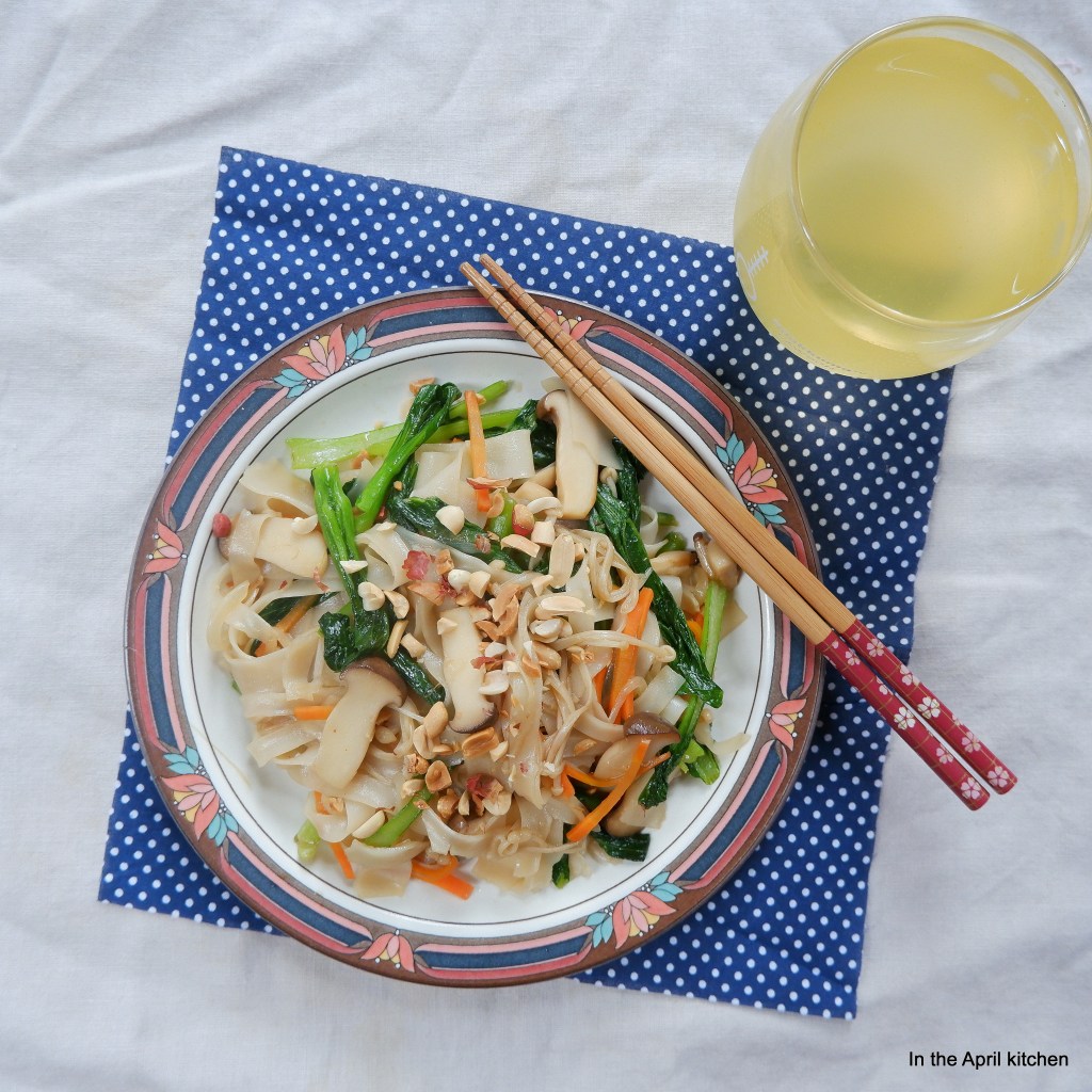 – Láng dầu lên chảo, cho nấm và cà rốt vào xào tới khi nấm gần chín thì cho rau cải ngọt cùng nấm kim châm vào, tiếp theo cho phở vào đảo đều tới khi phở chín, thì cho vào chảo 2 tbsp dầu hào và 1 tbsp xì dầu vào đảo đều
