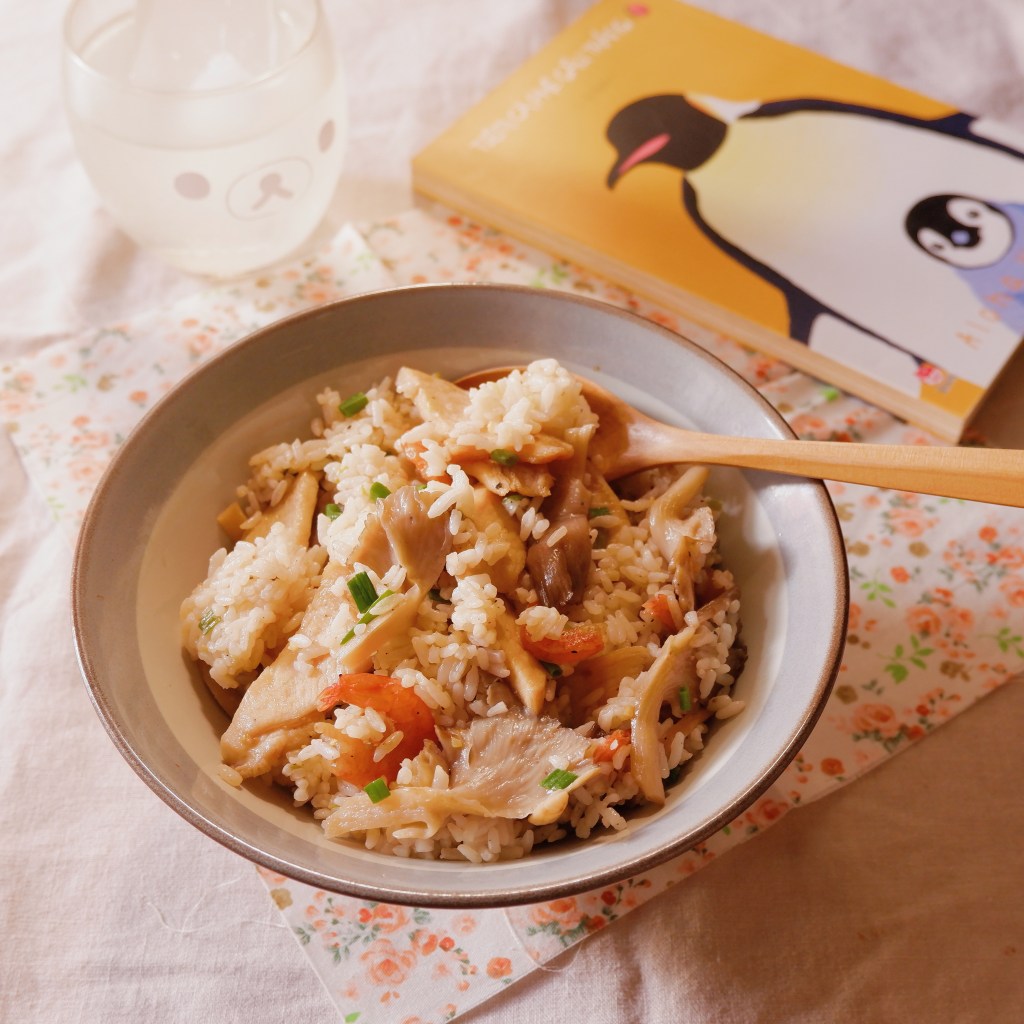 – Cơm chín, cho phần nhân đã xào lên, xới đều cơm trộn đều với thức ăn. Bật nấc nấu cơm thêm một lần nữa là được.