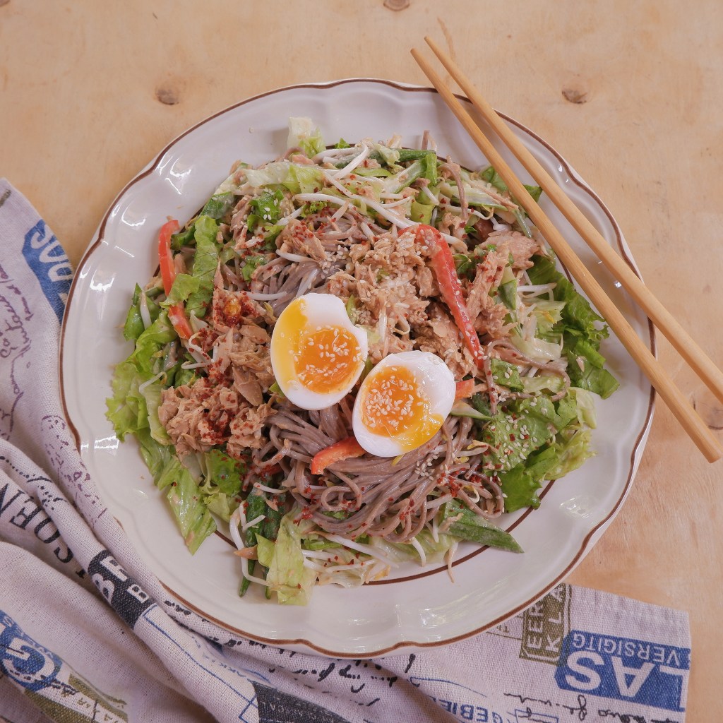 – Cho xà lách, đậu bắp, mì soba và cá ngừ vào một tô lớn. Cho phần sốt vào trộn đều, sắp đó gắp mì ra đĩa, đặt trứng luộc lòng đào lên rắc thêm ớt bột nếu muốn ăn cay hơn.