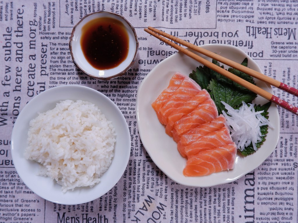 Mình hòa wasabi vào xì dầu, bào nhỏ củ cải. Xì dầu mang đến dư vị mằn mặn ngòn ngọt, khiến cảm giác ngọt của cơm càng sâu sắc hơn, wasabi cay hăng nồng, giúp từng miếng cá béo ngậy không bị ngấy, và củ cải bào, tưởng sẽ hăng mà ai dè vừa ngọt nhẹ thanh thanh vừa tươi mát.