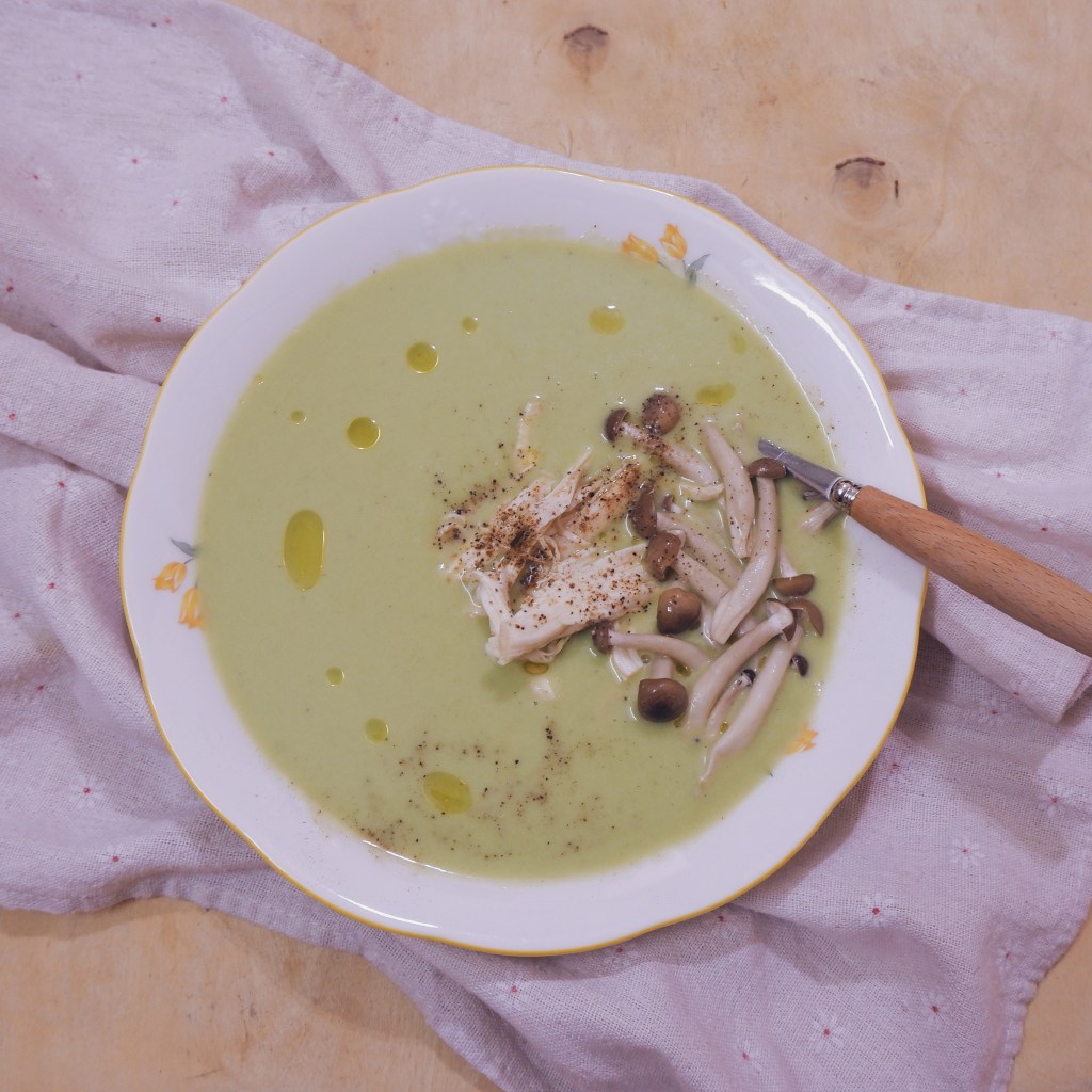 Tỏi tây: bạn có thể chỉ lấy phần đọt trắng của tỏi tây, súp sẽ có màu trắng kem ngà, mình xay cả phần lá xanh nên súp có màu xanh nhạt.