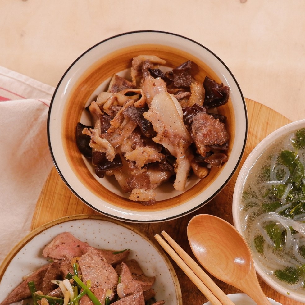 – Má heo thái thành miếng vừa ăn. Sau khi mộc nhĩ đã nở, cắt bỏ phần chân cứng rồi cũng thái thành miếng có kích thước tương đương má heo.