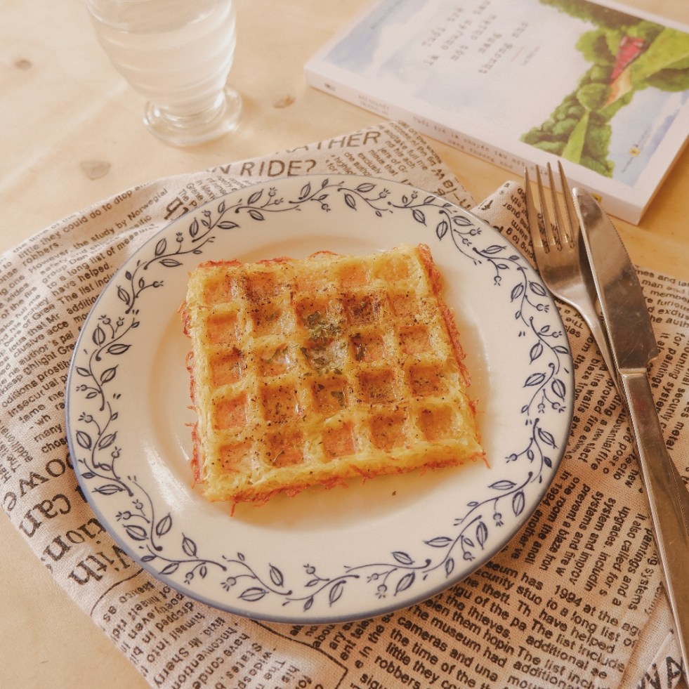 – Láng bơ lên máy kẹp waffle, xếp phần khoai sợi lên kín các góc của khay, phủ một lớp khoai tương đối dày sau đó kẹp máy xuống.