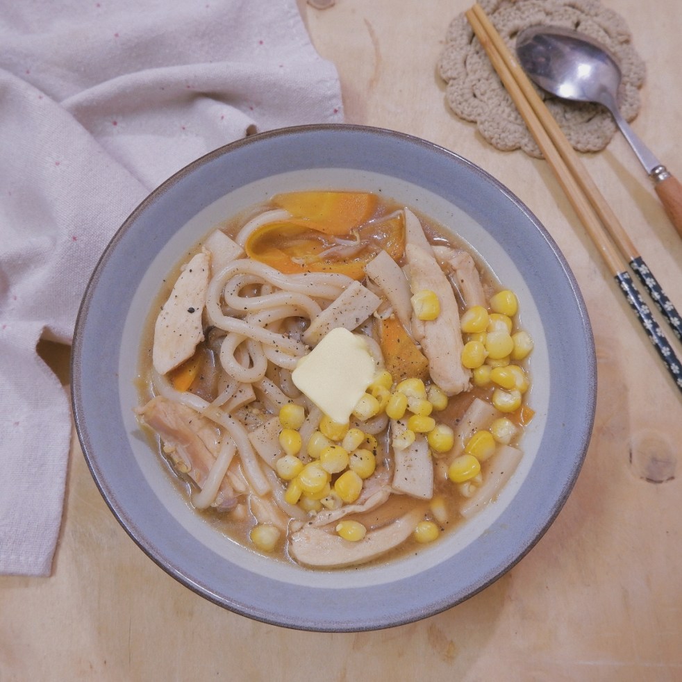 – Chần mì udon cho sợi mì nóng, sau đó cho vào bát, thêm vào mỗi bát 10g bơ động vật và ½ tbsp xì dầu, dùng đũa đảo đều cho mì ngấm bơ và xì dầu.