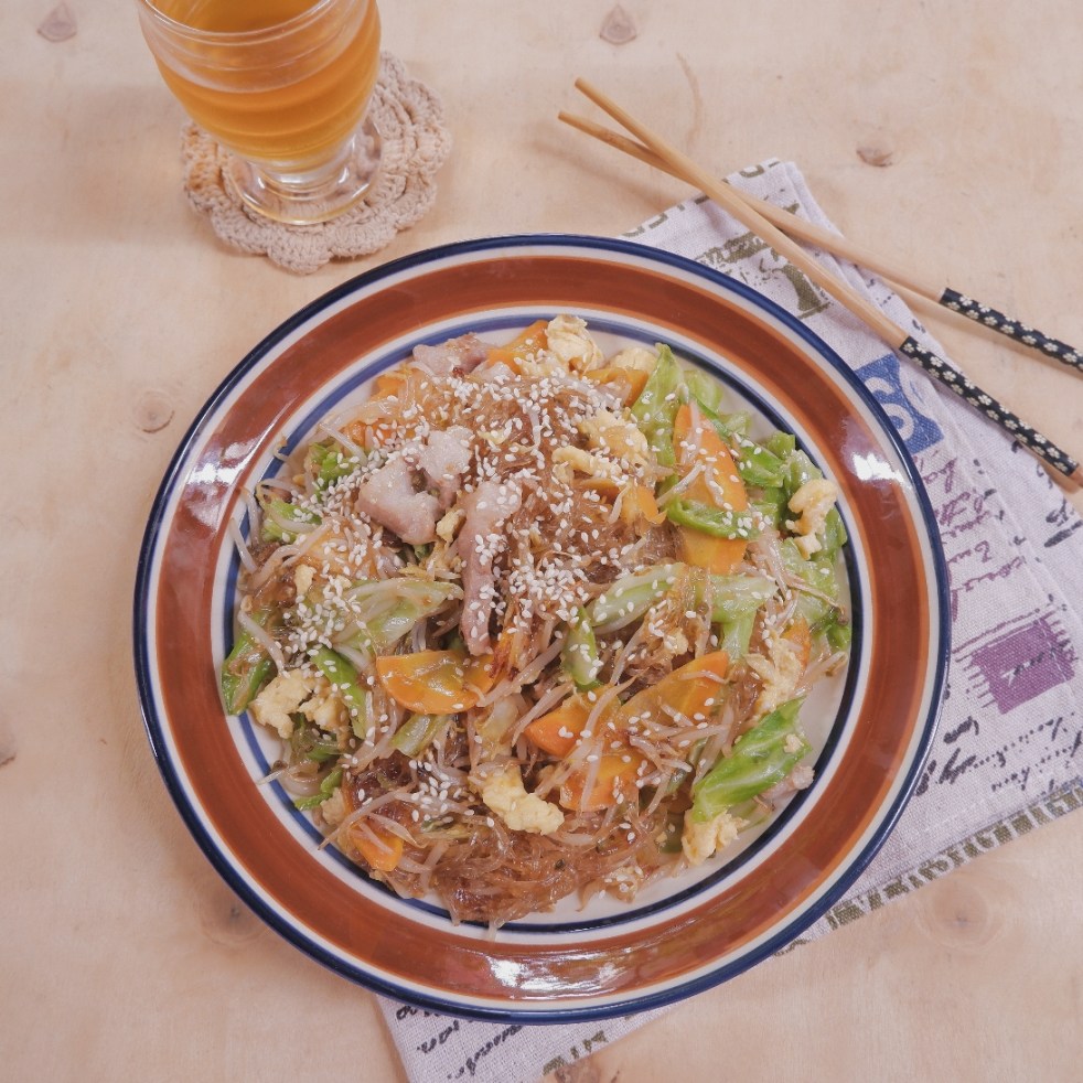 – Tận dụng phần chảo có dầu, cho hành khô lên phi thơm, sau đó cho thịt heo lên đảo tới khi thịt săn lại, hơi xém thì cho tiếp bắp cải và cà rốt vào, tới khi rau củ mềm xuống thì rưới phần sốt đã pha vào, sau đó cho miến vào đảo đều.