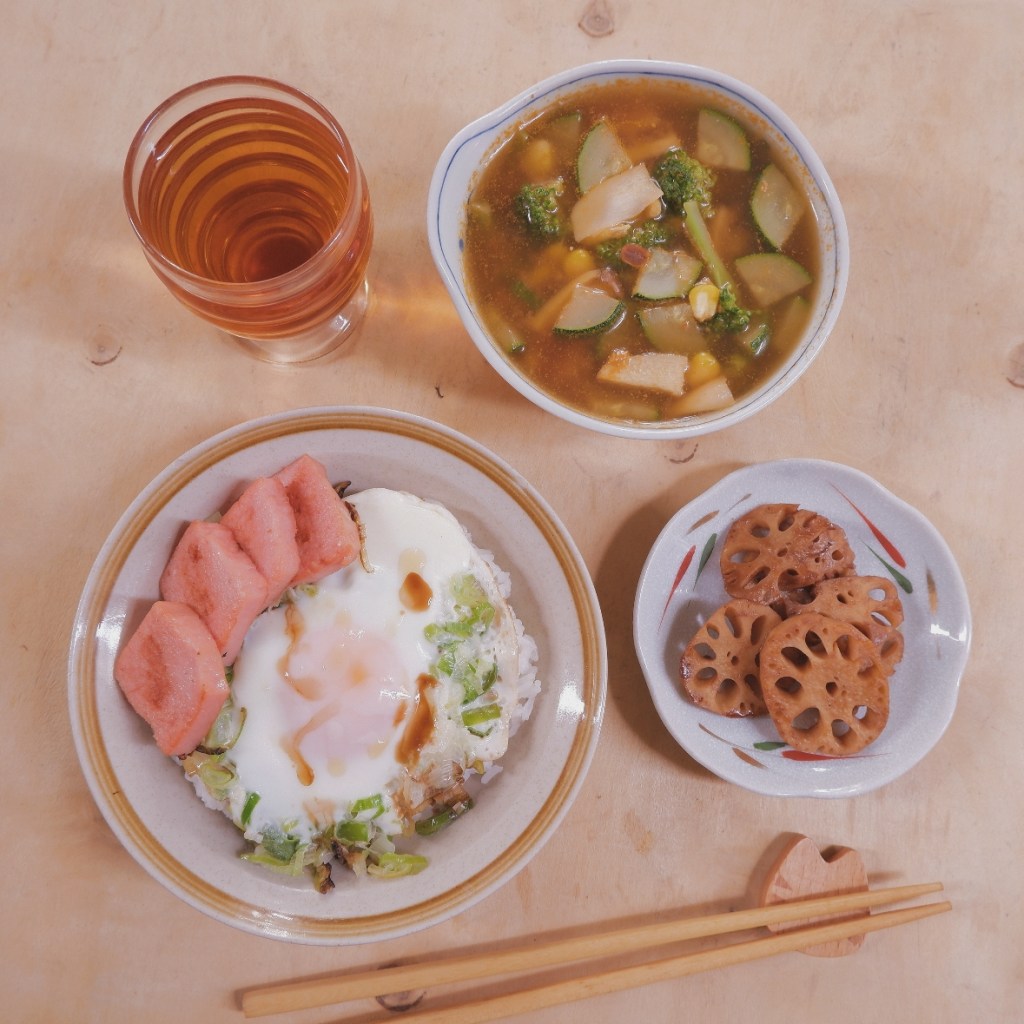 – Rưới dầu mè và xì dầu lên trứng, xếp thịt hộp chiên lên.