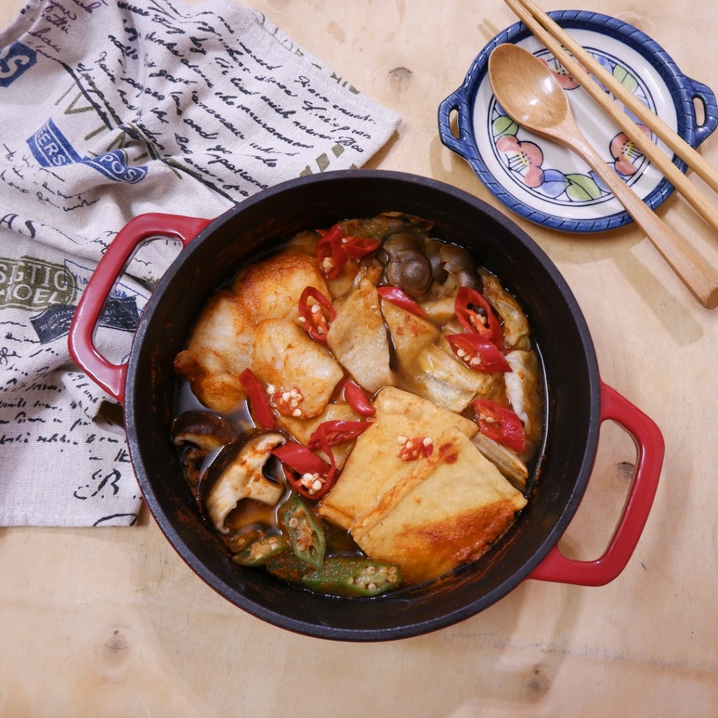– Chả cá Hàn Quốc thái thành miếng tam giác vừa ăn. Đậu phụ chiên lạng làm đôi. Thái ớt sừng thành khoanh nhỏ để trang trí.