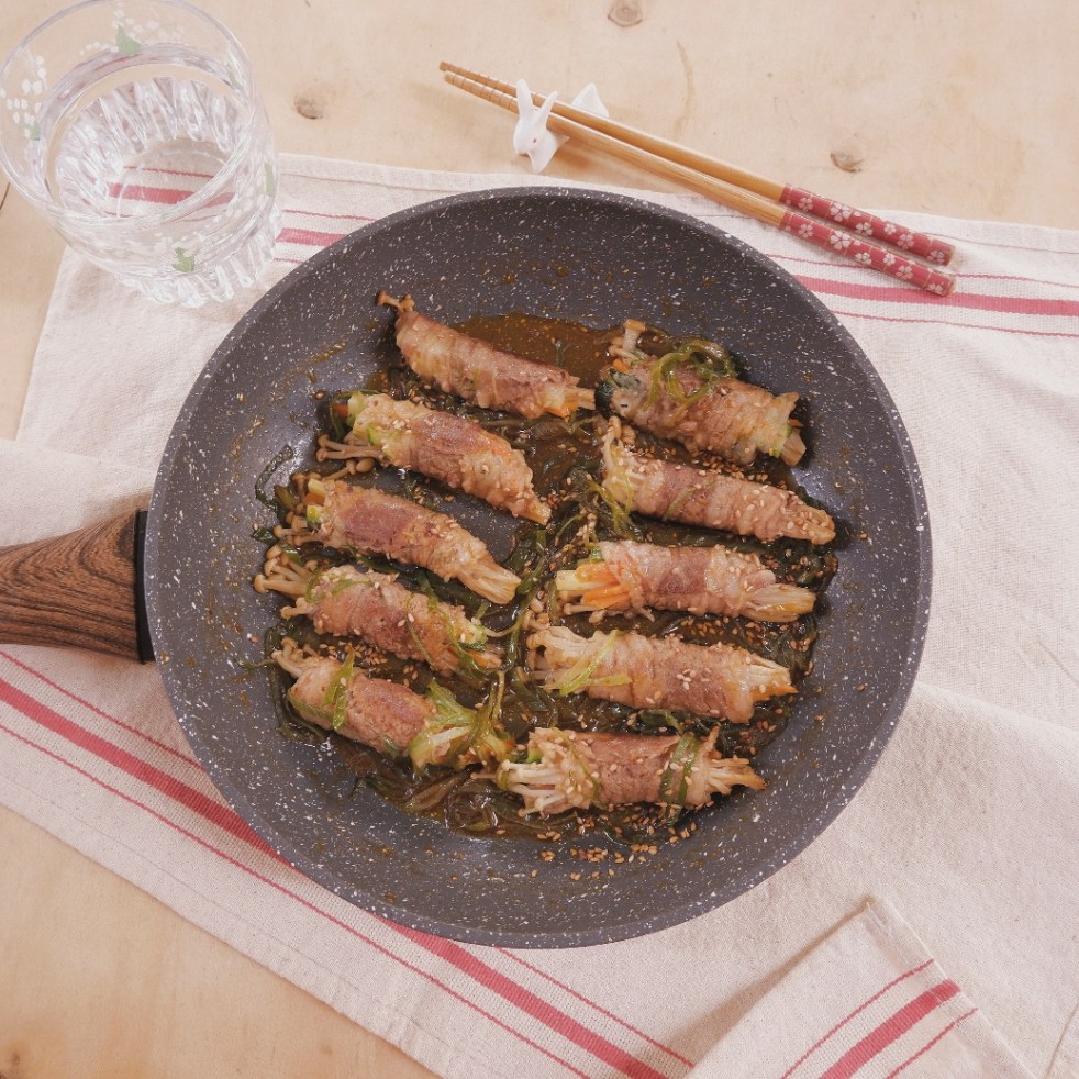 (2 người ăn) 20 lát ba chỉ bò Mỹ 1 gói nấm kim châm Nửa củ cà rốt 1 quả bí ngòi 1 tbsp dầu dừa 1 tbsp nước cốt dừa 1 cây hành boa-rô 2 tbsp xì dầu Muối, tiêu và gia vị cơ bản 20 que tăm nhỏ Cách làm: - Nấm kim… Continue reading Ba chỉ bò cuộn rau củ sốt dừa