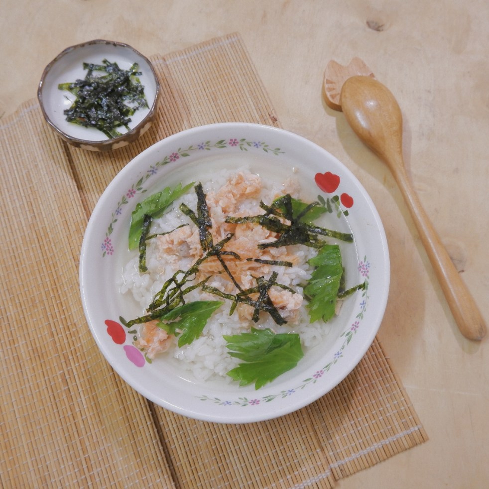 – Bày cơm lên bát, xếp cá hồi lên, cắt vụn rong biển lên, rải phần lá của cần tây lên, nêm mỗi bát 1 tsp muối ô mai.