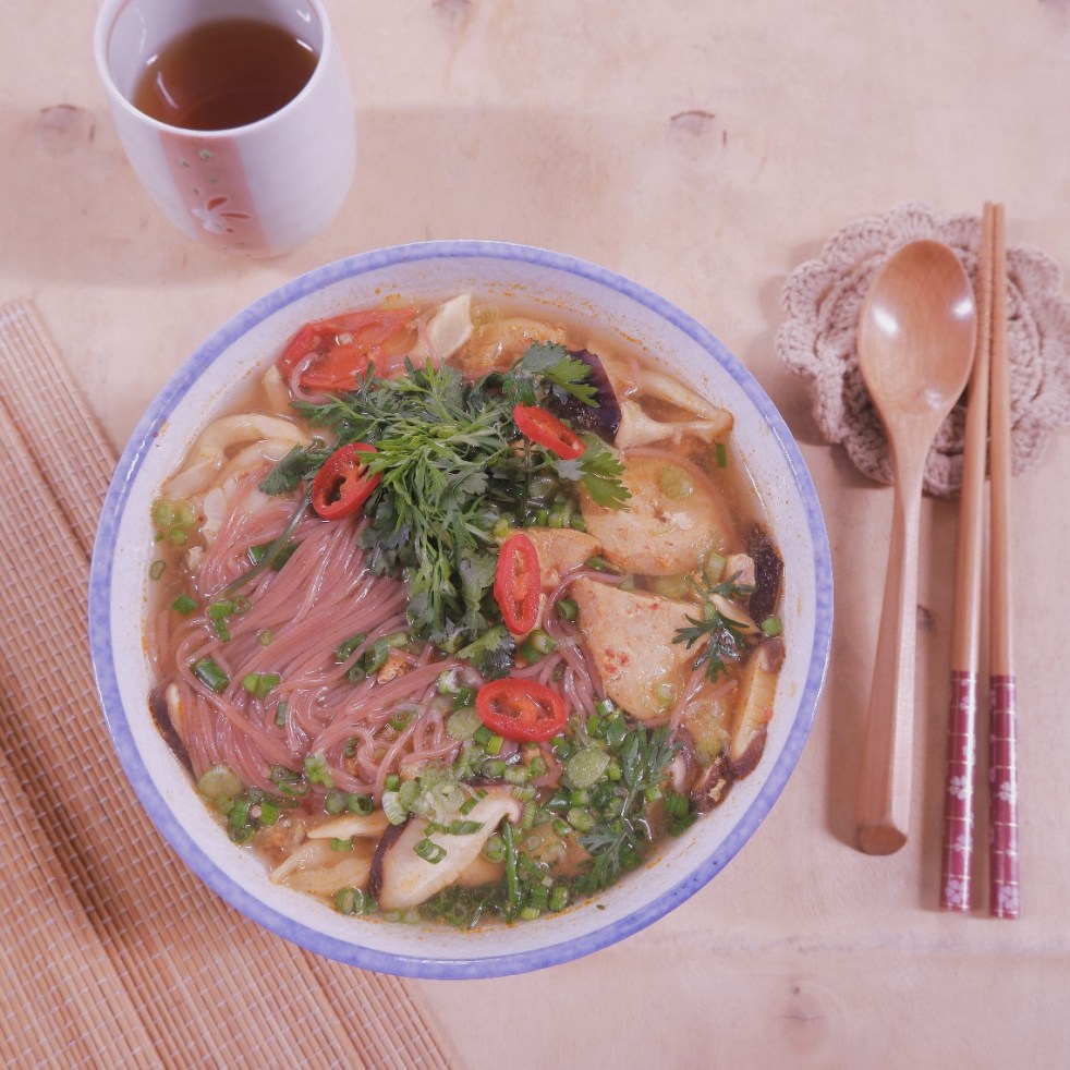 – Múc nước dùng, chia cá ngừ và nấm vào bát bún, rắc hành lá, rau mùi và thái ớt tươi lên. Ăn nóng.