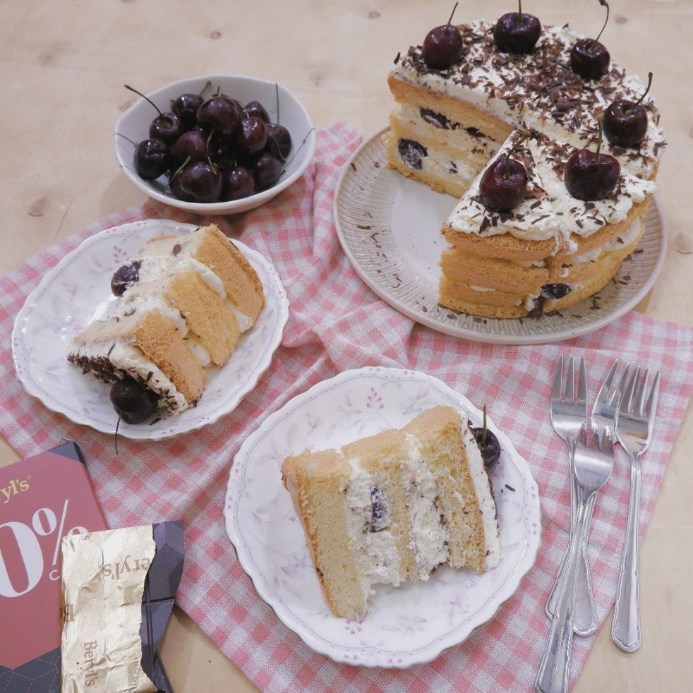 – Xả bạt bánh làm ba lớp, bắt kem lên và xếp anh đào lên, đặt các tầng bánh lên, phết kem hoặc bắt kem kín trên mặt, bào socola vụn lên nếu thích, đặt anh đào nguyên quả lên để trang trí.