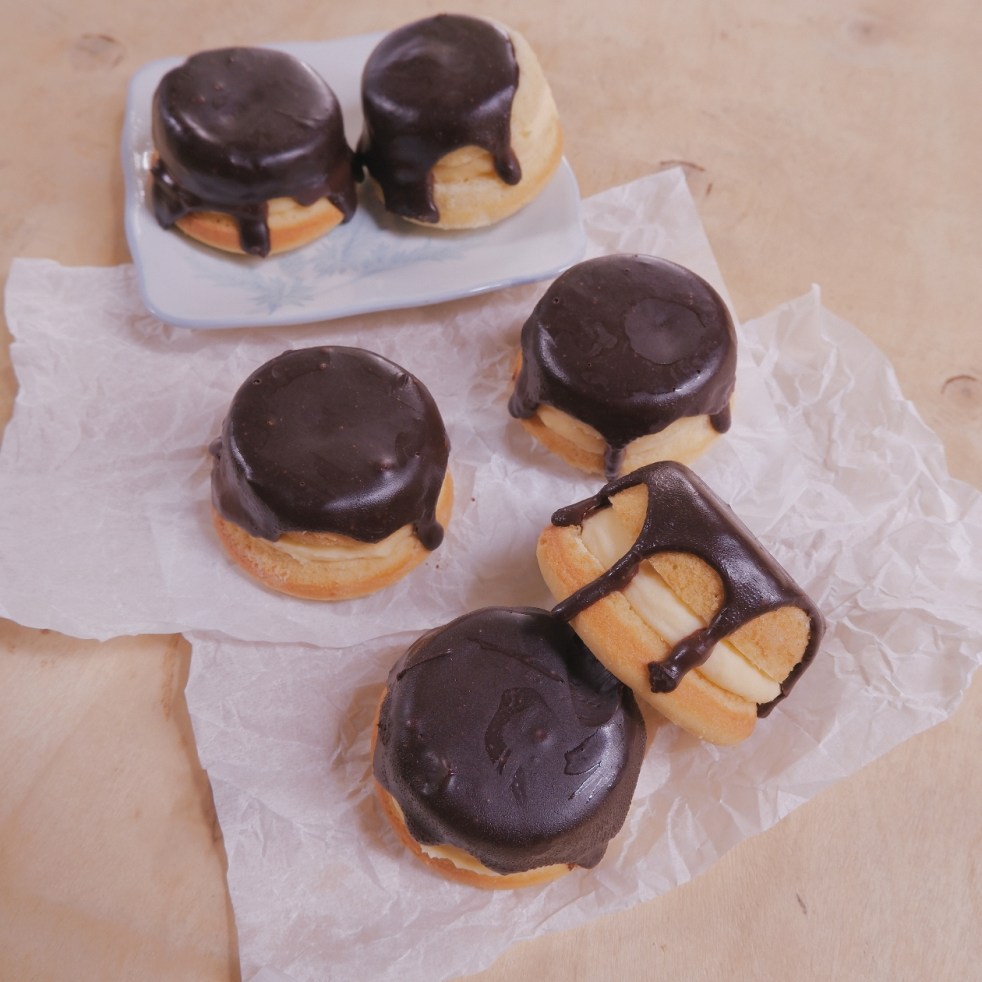 – Khi bánh và kem nguội, ta bơm đầy kem vào, kẹp bánh lại rồi nhúng vào hỗn hợp socola còn ấm.