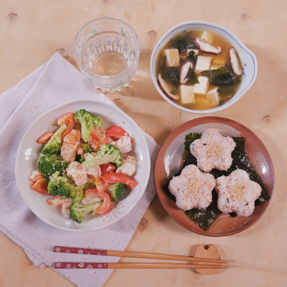 #8 Cơm nắm, salad tôm bông cải cùng canh đậu phụ nấm rong biển