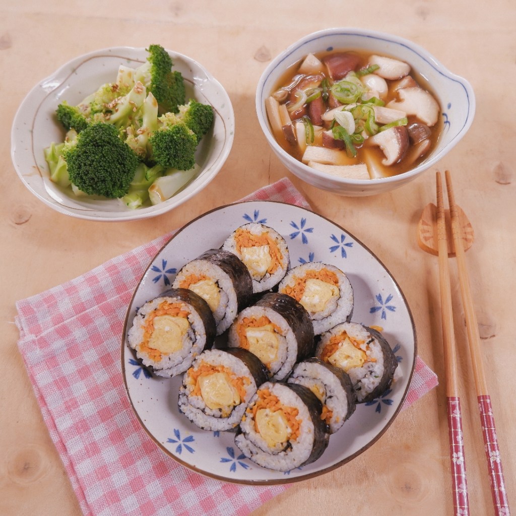 – Xếp cà rốt lên trước, sau đó đặt miếng trứng lên, nhẹ nhàng cuộn lại thật chặt tay, tới phần cuối có thể quết chút nước hoặc dùng vài hạt cơm dính lên phần rong biển hở ra để dán kín cuộn cơm lại. Lượng nguyên liệu đủ làm hai cuốn, tương tự với cuốn còn lại.