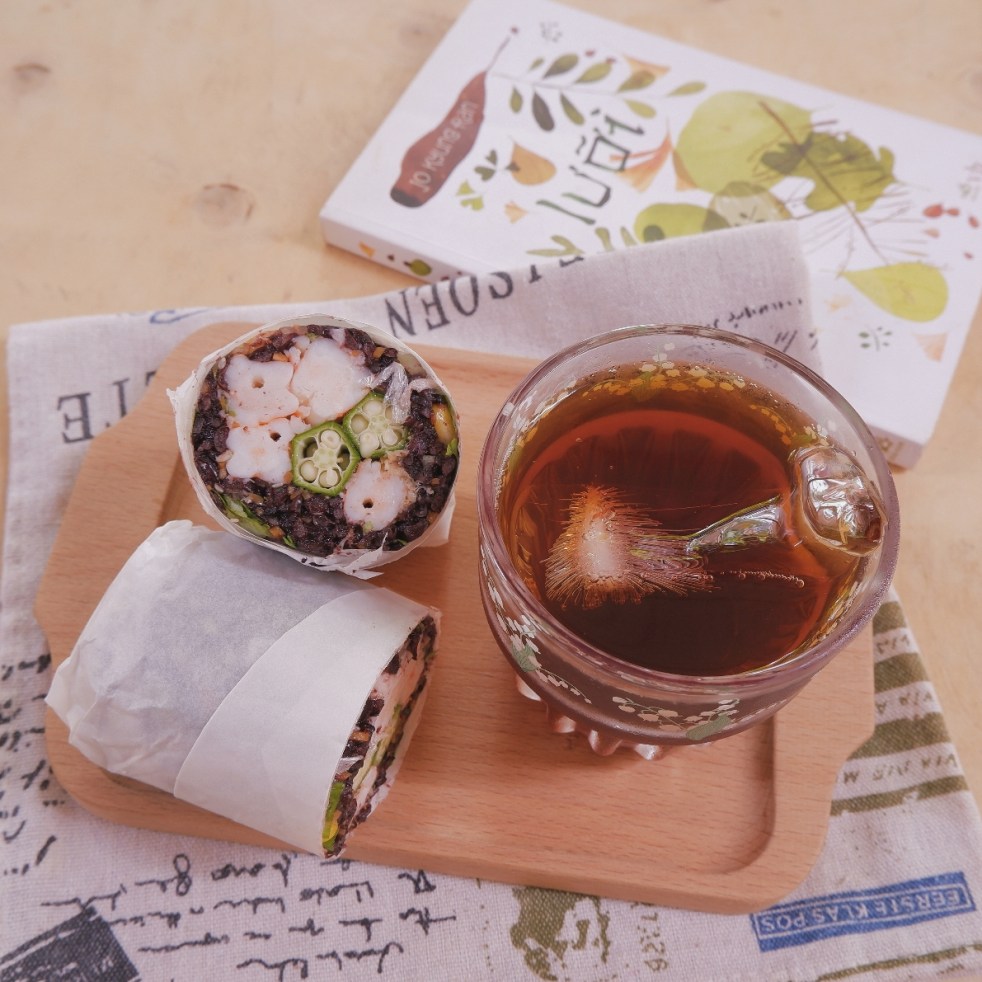 Cuộn cơm gạo lứt với tôm và đậu bắp