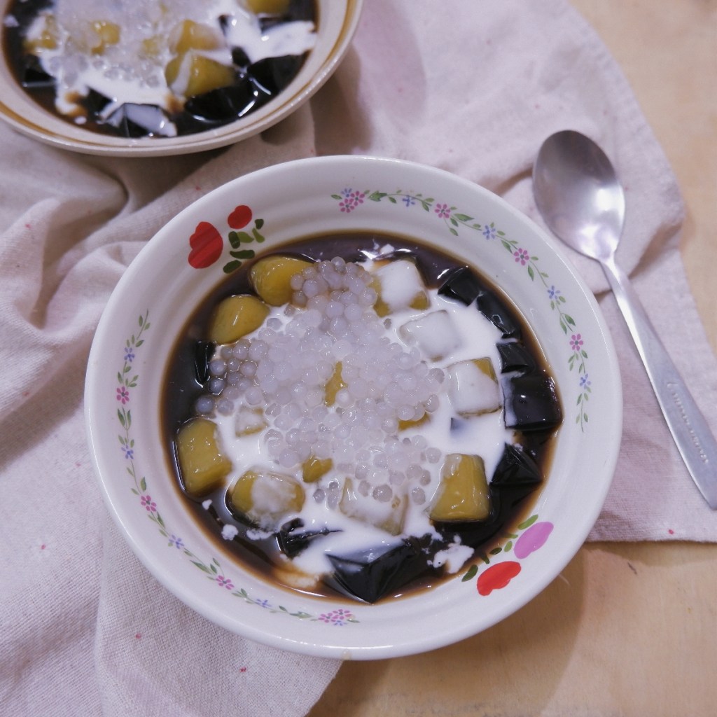 – Khi tất cả nguyên liệu đều đã mát hoặc nguội. Chia quy linh cao vào bát, tiếp theo là khoai dẻo và bột báng, rưới nước cốt dừa lên, nếu muốn ăn ngọt thêm bạn có thể cho thêm mật mía.