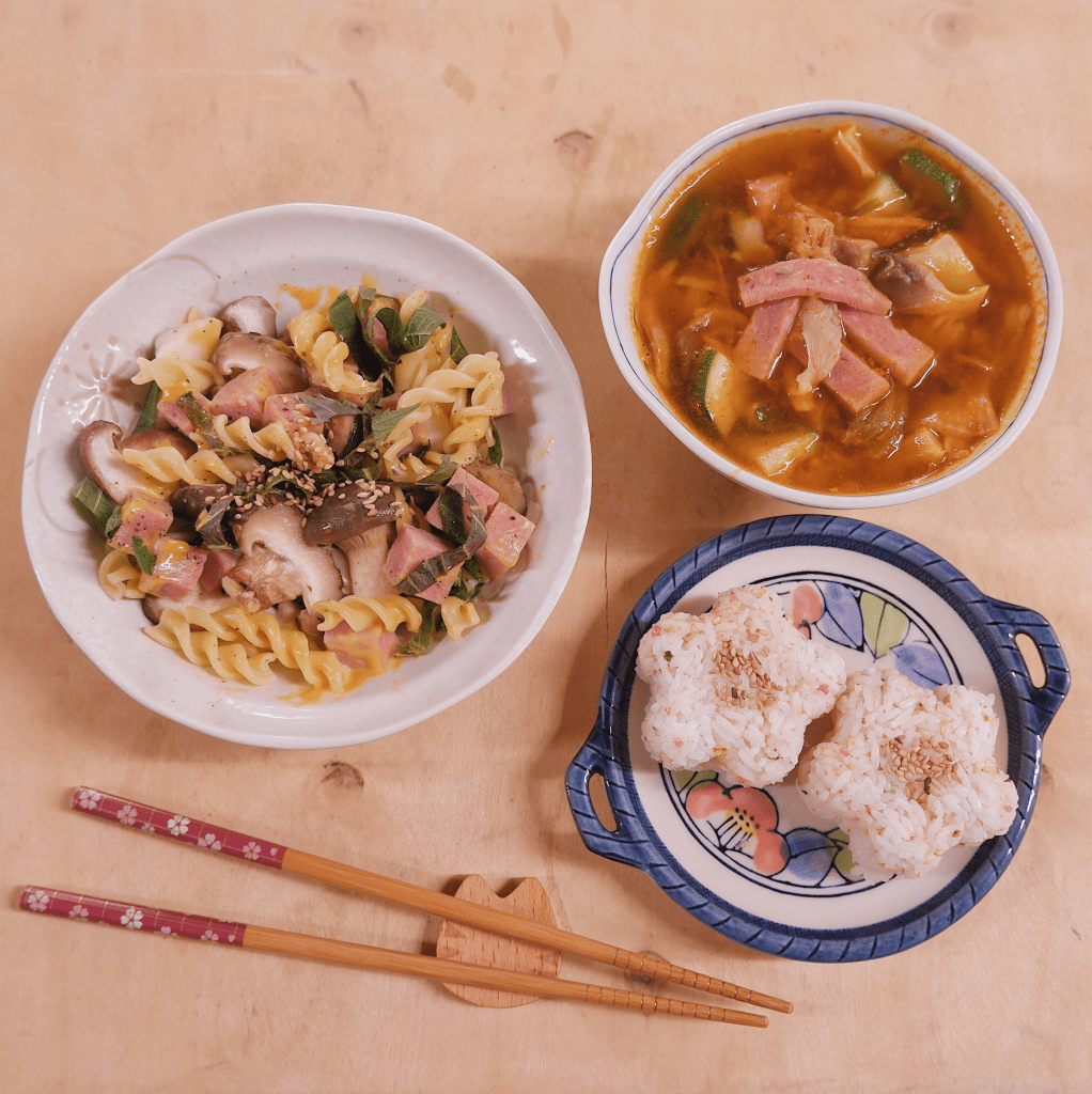 Kimchi thái nhỏ. Đậu phụ thái thành khối vuông nhỏ. Spam thái thành sợi dày