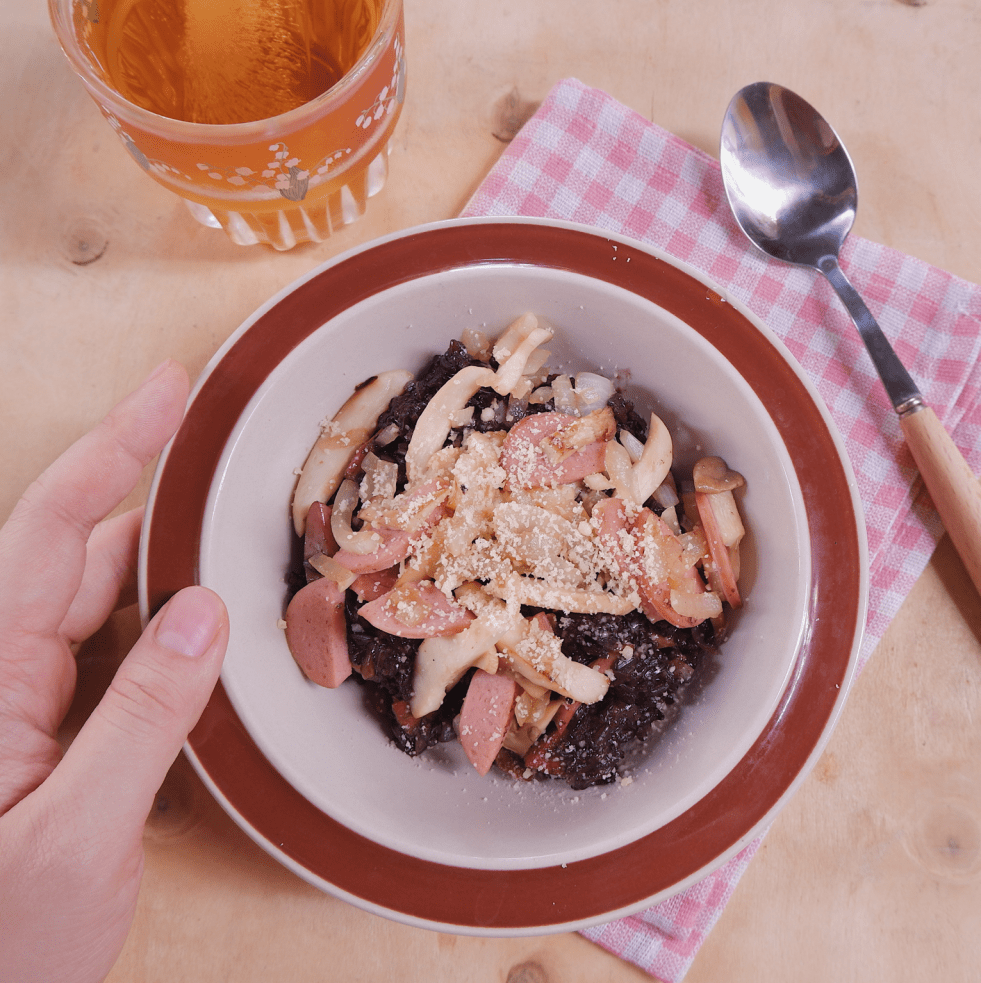 – Láng dầu lên chảo, cho hành tây vào phi vàng trước, sau đó cho xúc xích, đảo xúc xích xém thì cho thêm nấm vào, đợi nấm chín thì nêm nếm lại cho vừa miệng.