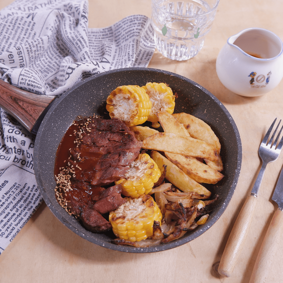 – Mỗi mặt 2-3 phút, ta sẽ được thịt ở mức trung bình, hơi hồng tái một chút, nếu bạn muốn ăn chín kỹ hơn có thể áp mỗi mặt thịt khoảng 4-5 phút tùy theo độ nóng của chảo.