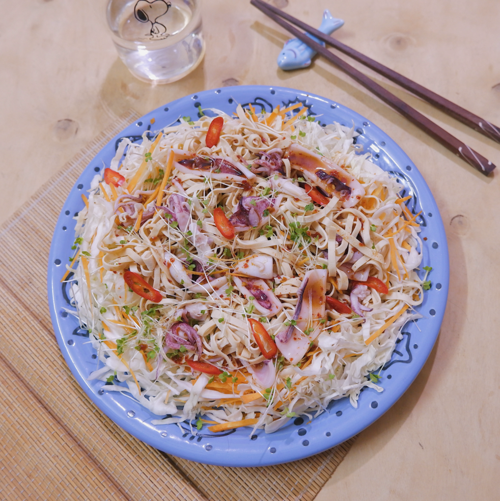 – Bày rau củ lên đĩa, tiếp đến là váng đậu, rau mầm, mực, thái thêm vài miếng ớt sừng xếp lên rồi rưới đều sốt nước mắm cay lên. Trộn đều trước khi ăn.