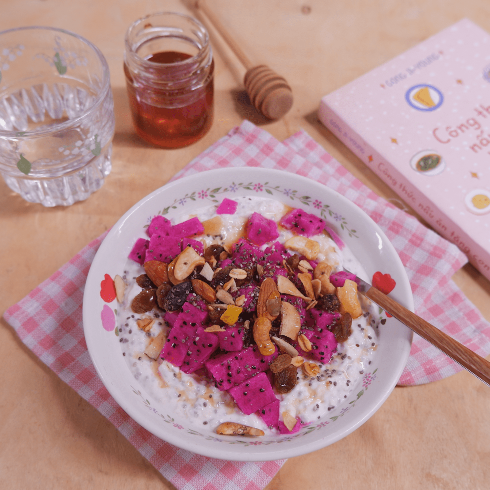 (1 người ăn) 1/2 cup yến mạch cán dẹt (~40g) 1 tbsp hạt chia 100g sữa chua Hy Lạp 100g sữa tươi không đường 1 tsp đường 1 tsp tinh dầu vanilla 1 tbsp mật ong 2-3 tbsp Granola Nửa quả thanh long đỏ Mật ong tuỳ khẩu vị Cách làm: - Trộn đều yến… Continue reading Yến mạch ngâm qua đêm với thanh long và granola