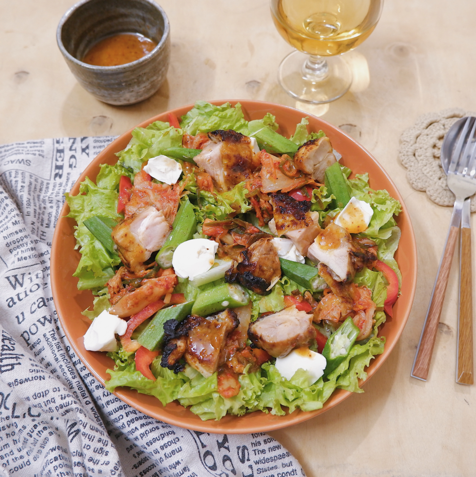 – Bày xà lách lên đĩa, thêm đậu bắp và ớt chuông, thêm thịt gà nướng và xen lẫn kimchi, cuối cùng chia kem phô mai thành miếng nhỏ và bày lên trên. Rưới sốt và trộn đều trước khi ăn.
