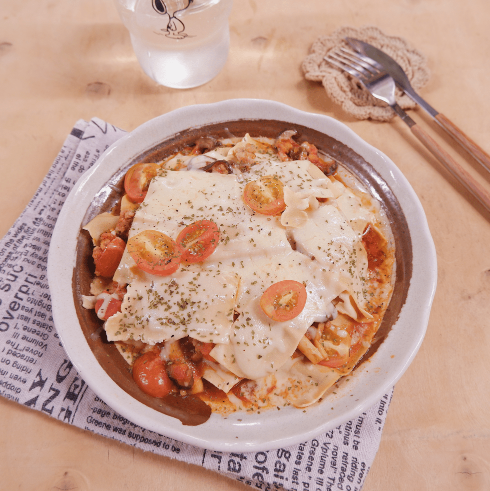 – Chọn đĩa sâu lòng chịu nhiệt, có thể bỏ vừa nồi chiên không dầu hoặc lò nướng. Xếp một lớp váng đậu lên đĩa, tiếp theo ta múc một ít sốt lên, dàn đều, rải thêm cà chua bi lên, phủ phô mai. Tiếp tục làm khoảng 3-4 lớp tới khi hết.