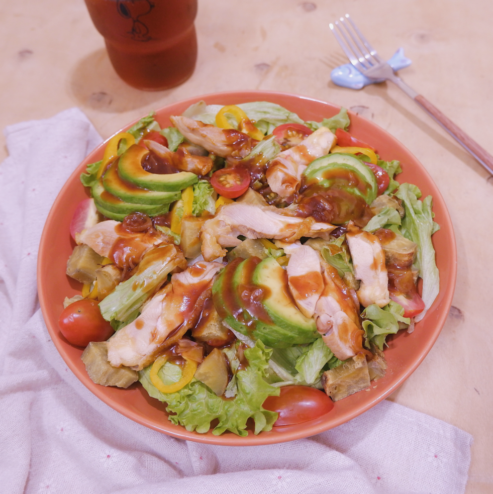 – Bày xà lách xuống dưới, tiếp theo là khoai lang, thịt gà, rải cà chua cùng ớt trái cây lên, xếp bơ thái miếng, rưới sốt và trộn đều ngay trước khi ăn.