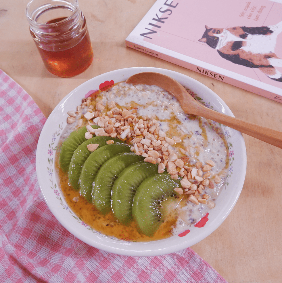 (1 người ăn) 1/2 cup yến mạch cán dẹt (~40g) 1 tbsp hạt chia 100g sữa chua 50g sữa tươi không đường 1 quả kiwi to 2 tbsp mật ong 2-3 tbsp hạt điều vỡ 1 quả kiwi cắt lát để trang trí Cách làm: - Kiwi bổ đôi, múc lấy phần ruột cho vào… Continue reading Yến mạch ngâm qua đêm vị kiwi