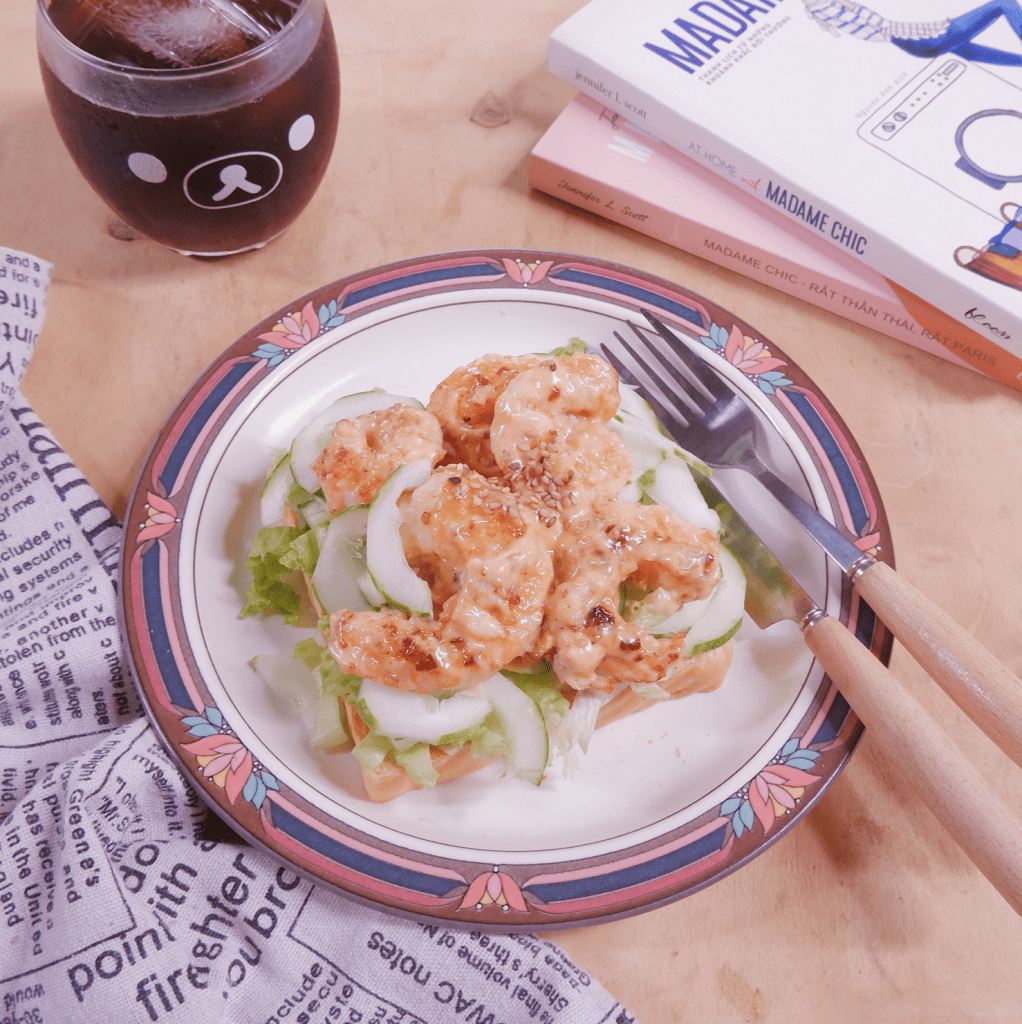 – Dùng một nửa hỗn hợp mayonnaise phết lên bánh mì, sau đó trộn đều tôm với nửa còn lại.