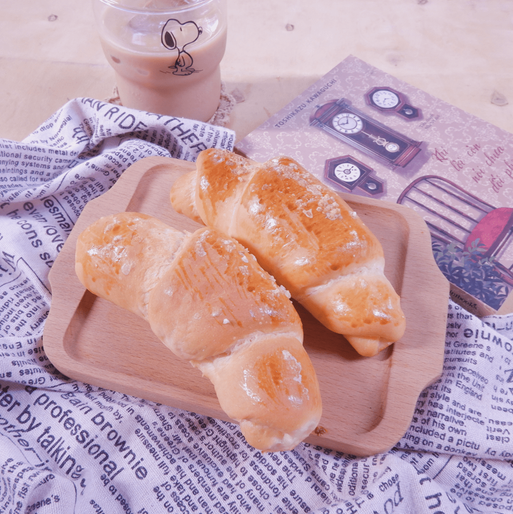 – Chia bột thành những khối nặng 70-75g, dém các góc viên tròn, sau đó dùng chày cán mỏng, cán thành hình tam giác với phần đỉnh dài giống như tạo hình bánh sừng bò. Đặt miếng bơ ở phần đáy, cuộn lại từ phần đáy tới phần đỉnh, dém chặt và đặt phần đỉnh xuống dưới để không bung ra khi nướng.