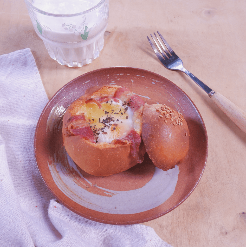 – Lót phô mai xuống dưới cùng, tiếp theo xếp thịt xông khói lên, cuối cùng đập trứng lên trên cùng.