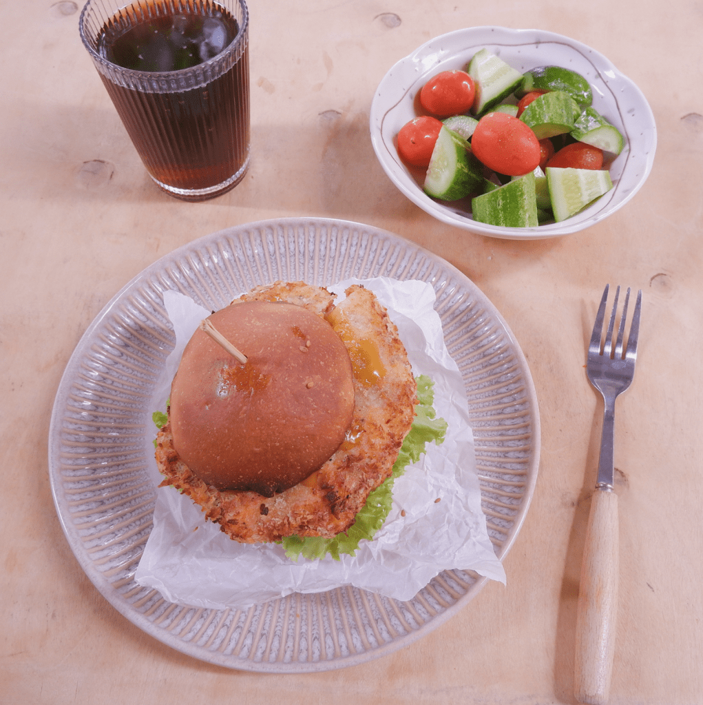 2 cái bánh hamburger (tự làm hoặc mua sẵn, công thức dựa trên công thức bánh mì nho khô, link ở blog trong mục giới thiệu)
