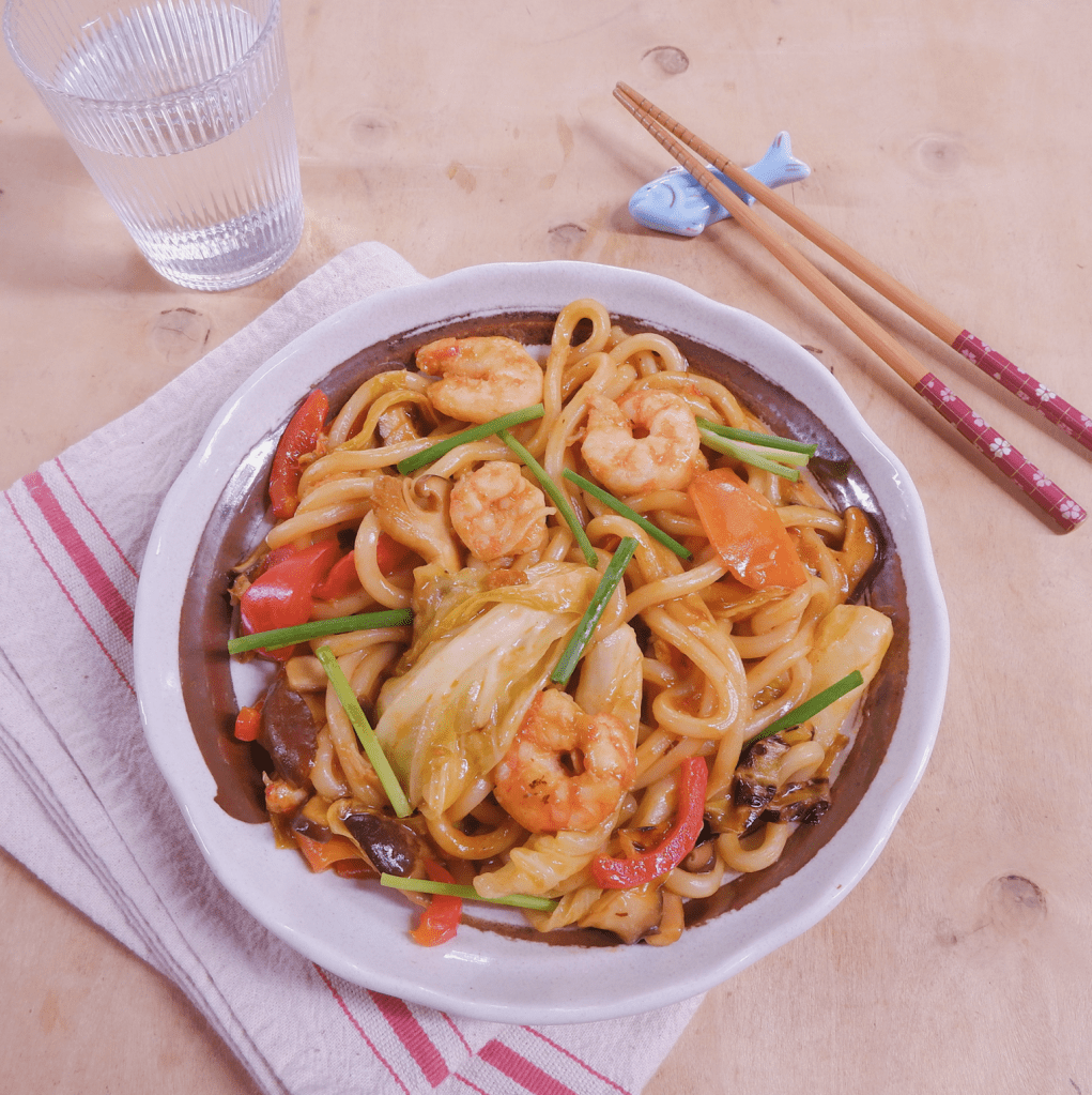 – Luộc chín mì udon, vớt ra thì cho ngay mì vào chảo sốt, đảo đều để udon thấm sốt, có thể cho lên bếp đảo khoảng 1-2 phút cho thấm là được.