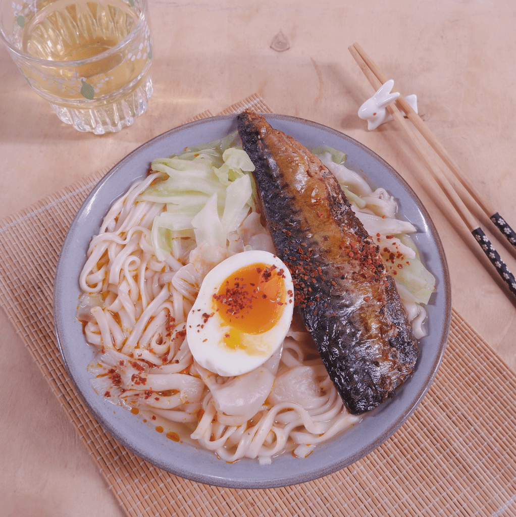 Làm nóng nước dùng, thả bắp cải vào đun tới khi bắp cải chín thì chan nước dùng và chia bắp cải lên mì, bày cá saba nướng và trứng luộc lên, rưới thêm dầu mè hoặc ớt bột lên trước khi ăn.