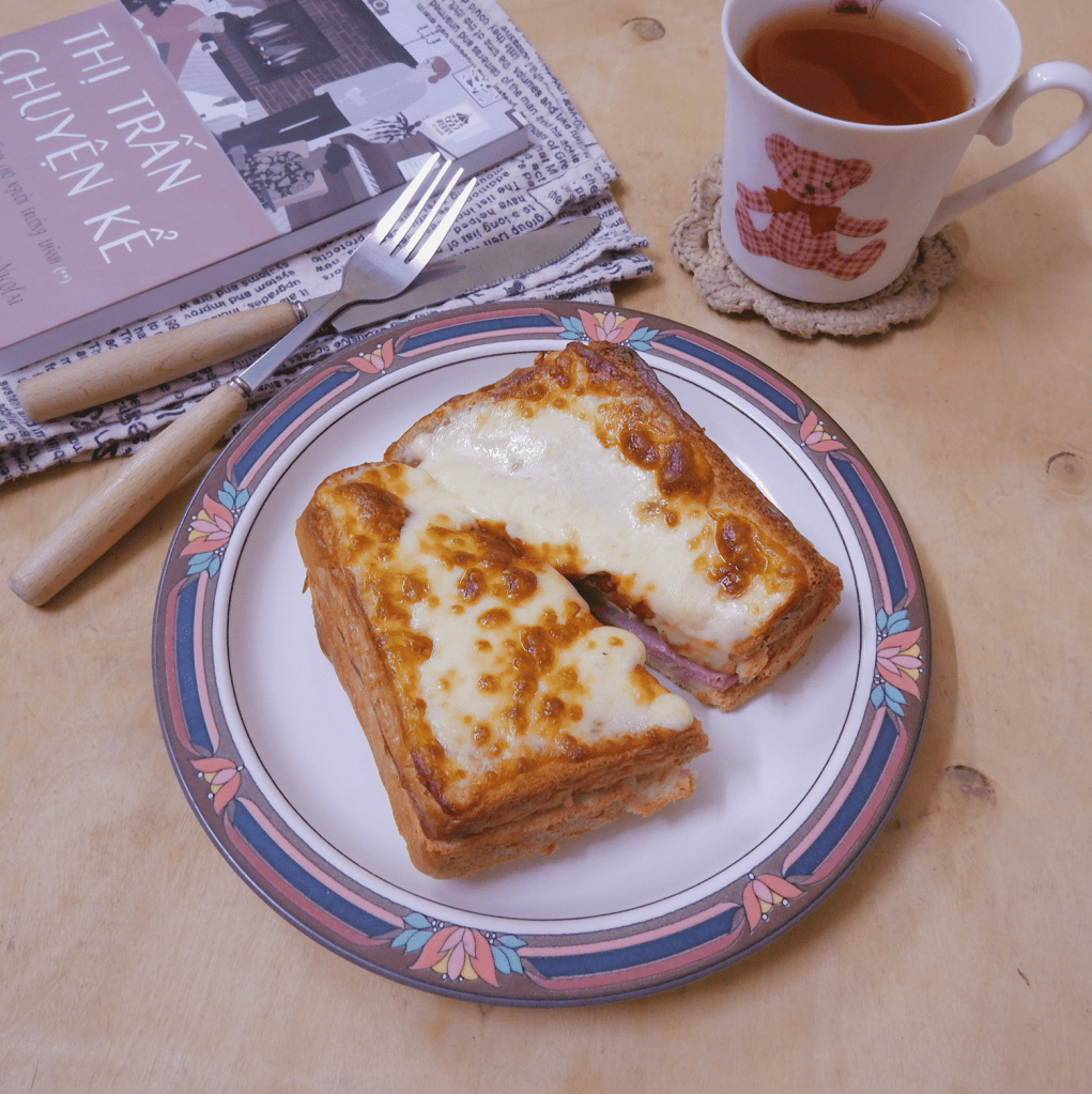 – Phết sốt mù tạt mật ong lên một lát bánh, xếp toàn bộ dăm bông lên, kẹp một lát bánh khác lên, phết sốt lên mặt bánh, xếp 2 lát phô mai lên, kẹp lát còn lại lên trên cùng.