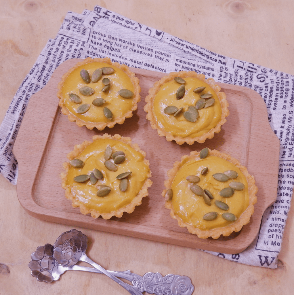 – Trộn phần kem tươi vào kem custard bí ngô tới khi hoà quyện. Chia phần kem này vào các đế bánh đã chuẩn bị sẵn, cắt giấy nến thành từng vuông nhỏ, áp lên mặt kem để kem không khô nứt khi bỏ tủ lạnh.