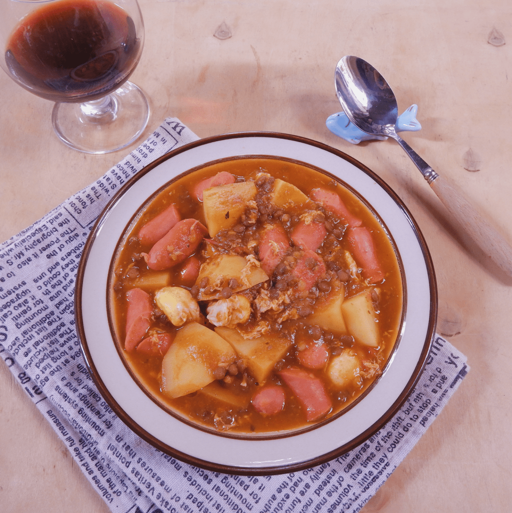 – Cho khoai tây đã chín sơ, xúc xích và đậu lăng vào, thêm lá nguyệt quế, hầm nhỏ liu riu nhỏ lửa khoảng 15 phút. Không nên đun quá to lửa, xúc xích sẽ bị vỡ và khô.