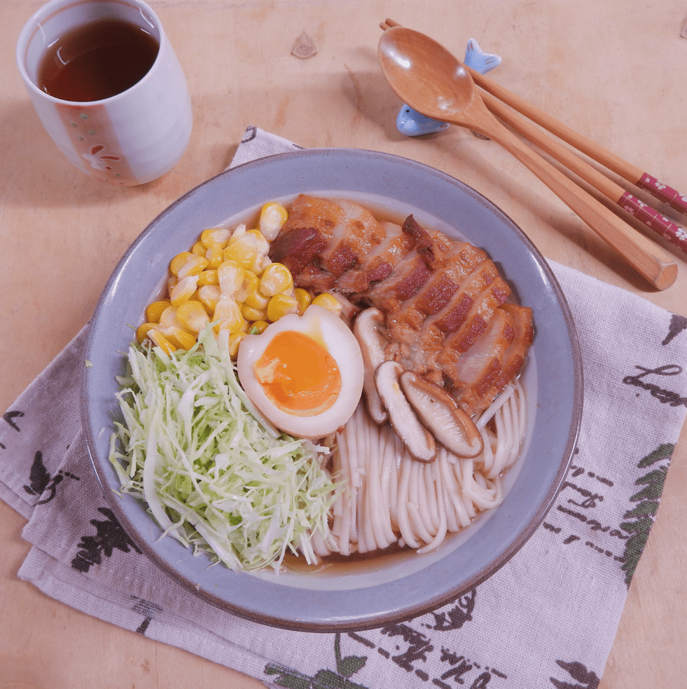 Mì ramen với nước dùng xì dầu, nấm hương với xá xíu