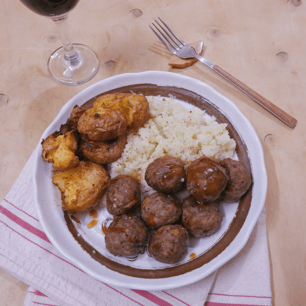 – Xúc súp lơ nghiền ra đĩa, bày khoai tây và thịt viên lên, rắc tiêu và ớt bột cho đều, có thể chấm các loại sốt bạn thích.