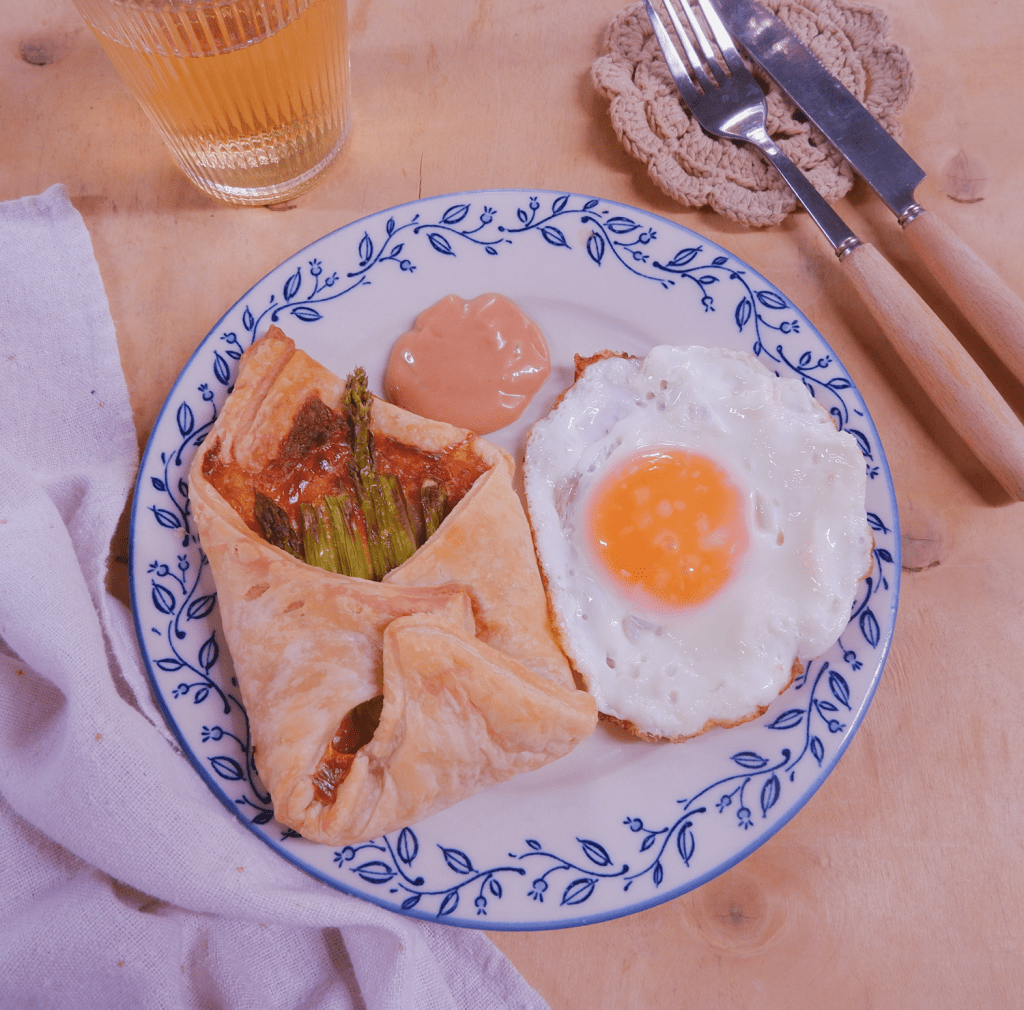 – Xếp thịt dăm bông lên, tiếp đến là phô mai lá, xếp măng tây lên phô mai, gấp lại như phong bì thư.